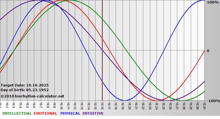Your biorhythm above the horizontal line indicates that your capacity in that area is enhanced; you feel stronger, more alert, more connected, more empathetic. These are times when you are able to do more, be more, enjoy more. When the biorhythm lines are below 0%, your capacity is diminished, and conservative behavior is recommended.