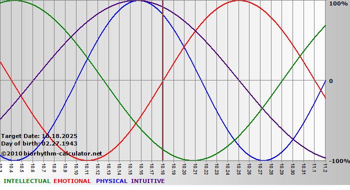 Your biorhythm above the horizontal line indicates that your capacity in that area is enhanced; you feel stronger, more alert, more connected, more empathetic. These are times when you are able to do more, be more, enjoy more. When the biorhythm lines are below 0%, your capacity is diminished, and conservative behavior is recommended.