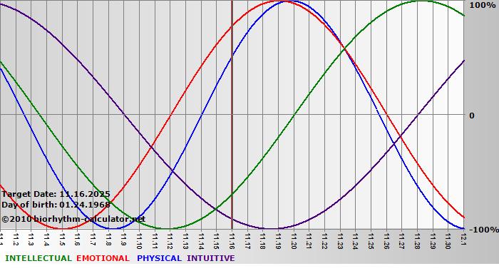 Your biorhythm above the horizontal line indicates that your capacity in that area is enhanced; you feel stronger, more alert, more connected, more empathetic. These are times when you are able to do more, be more, enjoy more. When the biorhythm lines are below 0%, your capacity is diminished, and conservative behavior is recommended.