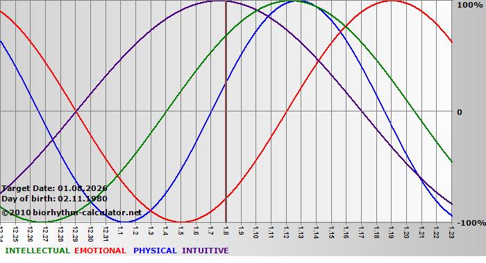 Your biorhythm above the horizontal line indicates that your capacity in that area is enhanced; you feel stronger, more alert, more connected, more empathetic. These are times when you are able to do more, be more, enjoy more. When the biorhythm lines are below 0%, your capacity is diminished, and conservative behavior is recommended.