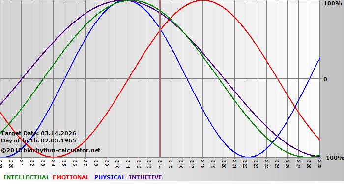 Your biorhythm above the horizontal line indicates that your capacity in that area is enhanced; you feel stronger, more alert, more connected, more empathetic. These are times when you are able to do more, be more, enjoy more. When the biorhythm lines are below 0%, your capacity is diminished, and conservative behavior is recommended.