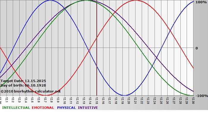 Your biorhythm above the horizontal line indicates that your capacity in that area is enhanced; you feel stronger, more alert, more connected, more empathetic. These are times when you are able to do more, be more, enjoy more. When the biorhythm lines are below 0%, your capacity is diminished, and conservative behavior is recommended.
