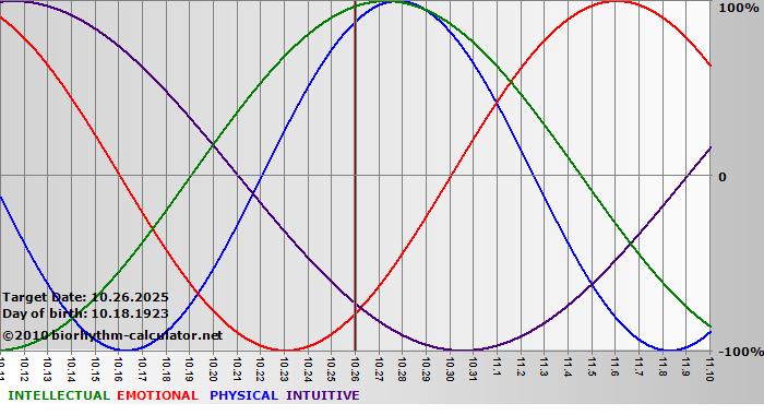 Your biorhythm above the horizontal line indicates that your capacity in that area is enhanced; you feel stronger, more alert, more connected, more empathetic. These are times when you are able to do more, be more, enjoy more. When the biorhythm lines are below 0%, your capacity is diminished, and conservative behavior is recommended.