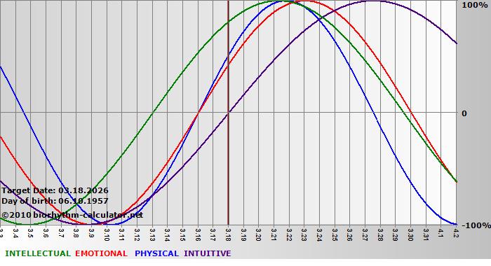 Your biorhythm above the horizontal line indicates that your capacity in that area is enhanced; you feel stronger, more alert, more connected, more empathetic. These are times when you are able to do more, be more, enjoy more. When the biorhythm lines are below 0%, your capacity is diminished, and conservative behavior is recommended.