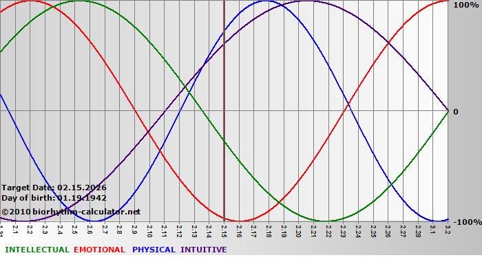Your biorhythm above the horizontal line indicates that your capacity in that area is enhanced; you feel stronger, more alert, more connected, more empathetic. These are times when you are able to do more, be more, enjoy more. When the biorhythm lines are below 0%, your capacity is diminished, and conservative behavior is recommended.