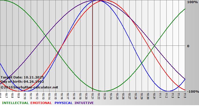 Your biorhythm above the horizontal line indicates that your capacity in that area is enhanced; you feel stronger, more alert, more connected, more empathetic. These are times when you are able to do more, be more, enjoy more. When the biorhythm lines are below 0%, your capacity is diminished, and conservative behavior is recommended.