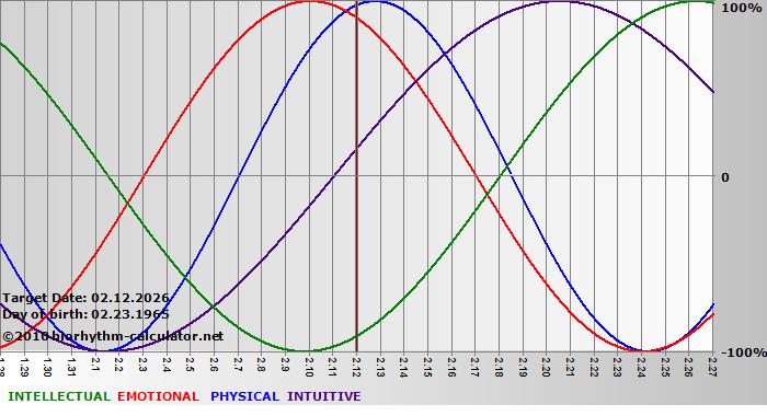 Your biorhythm above the horizontal line indicates that your capacity in that area is enhanced; you feel stronger, more alert, more connected, more empathetic. These are times when you are able to do more, be more, enjoy more. When the biorhythm lines are below 0%, your capacity is diminished, and conservative behavior is recommended.