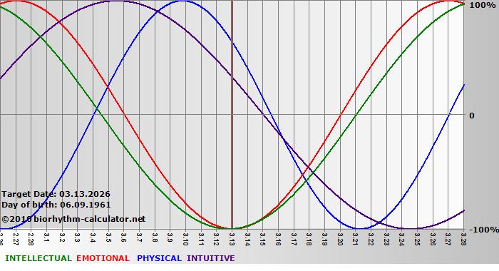 Your biorhythm above the horizontal line indicates that your capacity in that area is enhanced; you feel stronger, more alert, more connected, more empathetic. These are times when you are able to do more, be more, enjoy more. When the biorhythm lines are below 0%, your capacity is diminished, and conservative behavior is recommended.