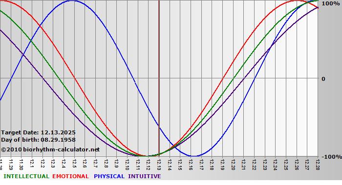 Your biorhythm above the horizontal line indicates that your capacity in that area is enhanced; you feel stronger, more alert, more connected, more empathetic. These are times when you are able to do more, be more, enjoy more. When the biorhythm lines are below 0%, your capacity is diminished, and conservative behavior is recommended.