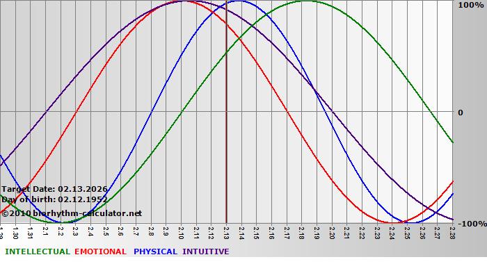 Your biorhythm above the horizontal line indicates that your capacity in that area is enhanced; you feel stronger, more alert, more connected, more empathetic. These are times when you are able to do more, be more, enjoy more. When the biorhythm lines are below 0%, your capacity is diminished, and conservative behavior is recommended.
