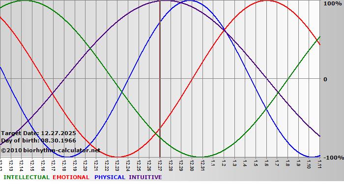 Your biorhythm above the horizontal line indicates that your capacity in that area is enhanced; you feel stronger, more alert, more connected, more empathetic. These are times when you are able to do more, be more, enjoy more. When the biorhythm lines are below 0%, your capacity is diminished, and conservative behavior is recommended.