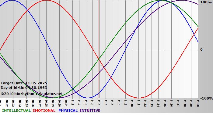 Your biorhythm above the horizontal line indicates that your capacity in that area is enhanced; you feel stronger, more alert, more connected, more empathetic. These are times when you are able to do more, be more, enjoy more. When the biorhythm lines are below 0%, your capacity is diminished, and conservative behavior is recommended.