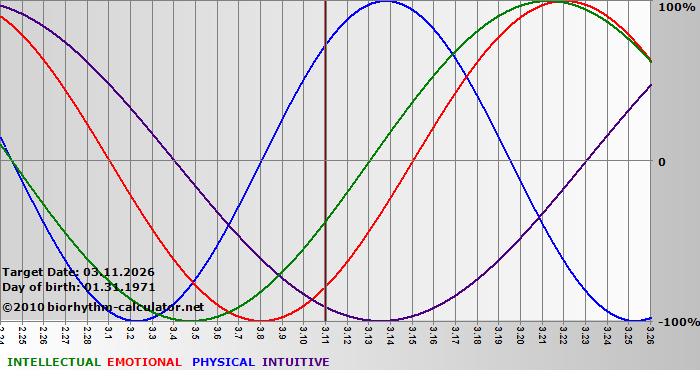 Your biorhythm above the horizontal line indicates that your capacity in that area is enhanced; you feel stronger, more alert, more connected, more empathetic. These are times when you are able to do more, be more, enjoy more. When the biorhythm lines are below 0%, your capacity is diminished, and conservative behavior is recommended.
