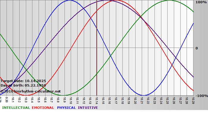 Your biorhythm above the horizontal line indicates that your capacity in that area is enhanced; you feel stronger, more alert, more connected, more empathetic. These are times when you are able to do more, be more, enjoy more. When the biorhythm lines are below 0%, your capacity is diminished, and conservative behavior is recommended.
