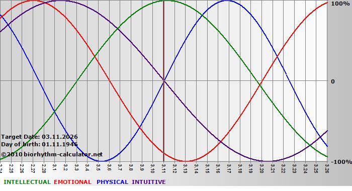 Your biorhythm above the horizontal line indicates that your capacity in that area is enhanced; you feel stronger, more alert, more connected, more empathetic. These are times when you are able to do more, be more, enjoy more. When the biorhythm lines are below 0%, your capacity is diminished, and conservative behavior is recommended.