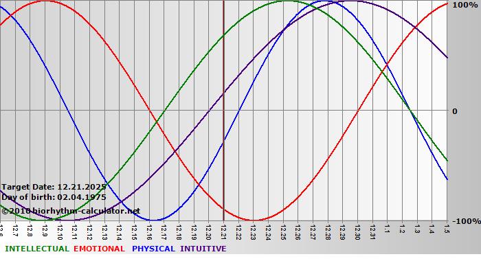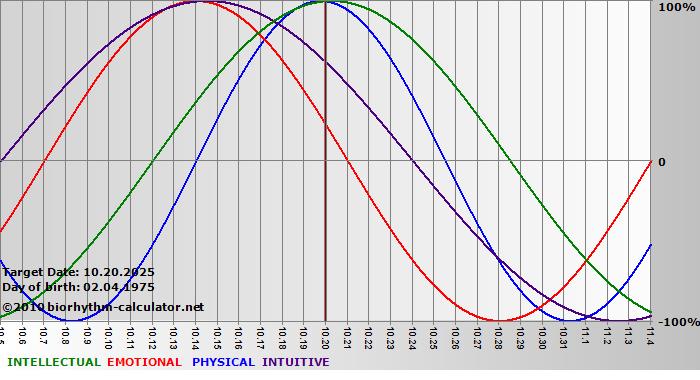 Your biorhythm above the horizontal line indicates that your capacity in that area is enhanced; you feel stronger, more alert, more connected, more empathetic. These are times when you are able to do more, be more, enjoy more. When the biorhythm lines are below 0%, your capacity is diminished, and conservative behavior is recommended.