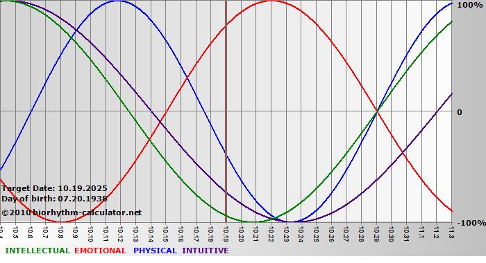 Your biorhythm above the horizontal line indicates that your capacity in that area is enhanced; you feel stronger, more alert, more connected, more empathetic. These are times when you are able to do more, be more, enjoy more. When the biorhythm lines are below 0%, your capacity is diminished, and conservative behavior is recommended.