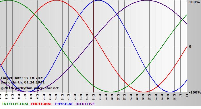 Your biorhythm above the horizontal line indicates that your capacity in that area is enhanced; you feel stronger, more alert, more connected, more empathetic. These are times when you are able to do more, be more, enjoy more. When the biorhythm lines are below 0%, your capacity is diminished, and conservative behavior is recommended.