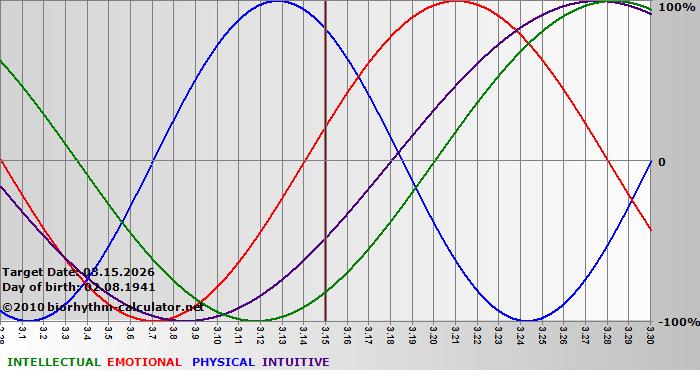 Your biorhythm above the horizontal line indicates that your capacity in that area is enhanced; you feel stronger, more alert, more connected, more empathetic. These are times when you are able to do more, be more, enjoy more. When the biorhythm lines are below 0%, your capacity is diminished, and conservative behavior is recommended.