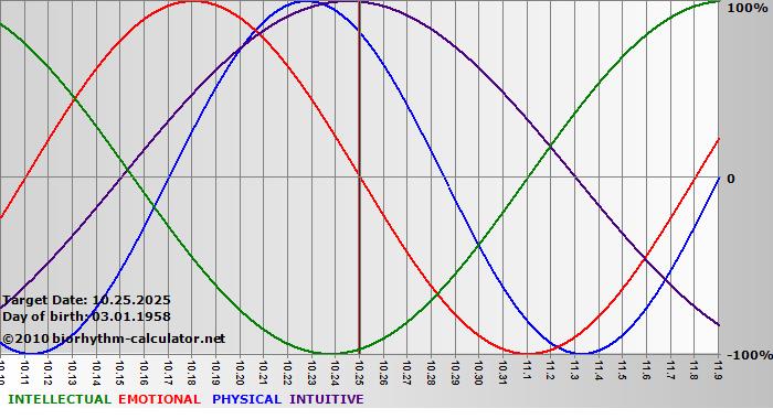 Your biorhythm above the horizontal line indicates that your capacity in that area is enhanced; you feel stronger, more alert, more connected, more empathetic. These are times when you are able to do more, be more, enjoy more. When the biorhythm lines are below 0%, your capacity is diminished, and conservative behavior is recommended.