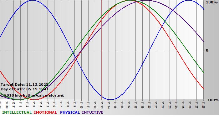 Your biorhythm above the horizontal line indicates that your capacity in that area is enhanced; you feel stronger, more alert, more connected, more empathetic. These are times when you are able to do more, be more, enjoy more. When the biorhythm lines are below 0%, your capacity is diminished, and conservative behavior is recommended.