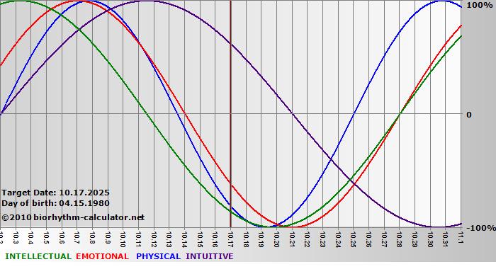 Your biorhythm above the horizontal line indicates that your capacity in that area is enhanced; you feel stronger, more alert, more connected, more empathetic. These are times when you are able to do more, be more, enjoy more. When the biorhythm lines are below 0%, your capacity is diminished, and conservative behavior is recommended.