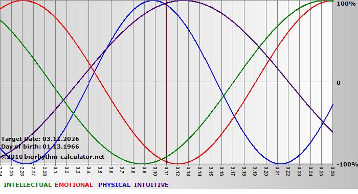 Your biorhythm above the horizontal line indicates that your capacity in that area is enhanced; you feel stronger, more alert, more connected, more empathetic. These are times when you are able to do more, be more, enjoy more. When the biorhythm lines are below 0%, your capacity is diminished, and conservative behavior is recommended.