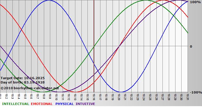 Your biorhythm above the horizontal line indicates that your capacity in that area is enhanced; you feel stronger, more alert, more connected, more empathetic. These are times when you are able to do more, be more, enjoy more. When the biorhythm lines are below 0%, your capacity is diminished, and conservative behavior is recommended.