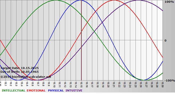 Your biorhythm above the horizontal line indicates that your capacity in that area is enhanced; you feel stronger, more alert, more connected, more empathetic. These are times when you are able to do more, be more, enjoy more. When the biorhythm lines are below 0%, your capacity is diminished, and conservative behavior is recommended.