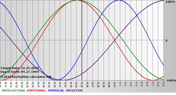 Your biorhythm above the horizontal line indicates that your capacity in that area is enhanced; you feel stronger, more alert, more connected, more empathetic. These are times when you are able to do more, be more, enjoy more. When the biorhythm lines are below 0%, your capacity is diminished, and conservative behavior is recommended.