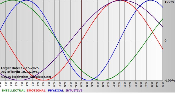 Your biorhythm above the horizontal line indicates that your capacity in that area is enhanced; you feel stronger, more alert, more connected, more empathetic. These are times when you are able to do more, be more, enjoy more. When the biorhythm lines are below 0%, your capacity is diminished, and conservative behavior is recommended.