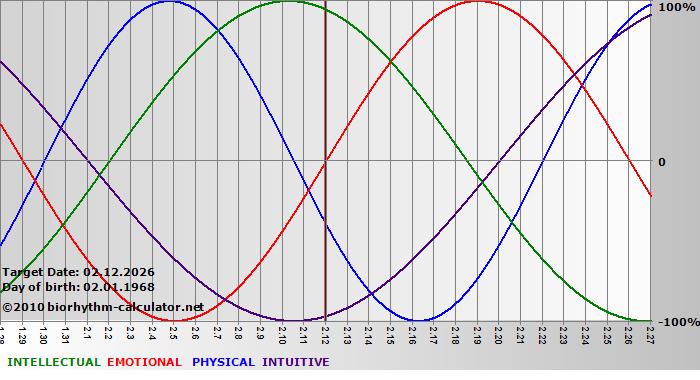 Your biorhythm above the horizontal line indicates that your capacity in that area is enhanced; you feel stronger, more alert, more connected, more empathetic. These are times when you are able to do more, be more, enjoy more. When the biorhythm lines are below 0%, your capacity is diminished, and conservative behavior is recommended.