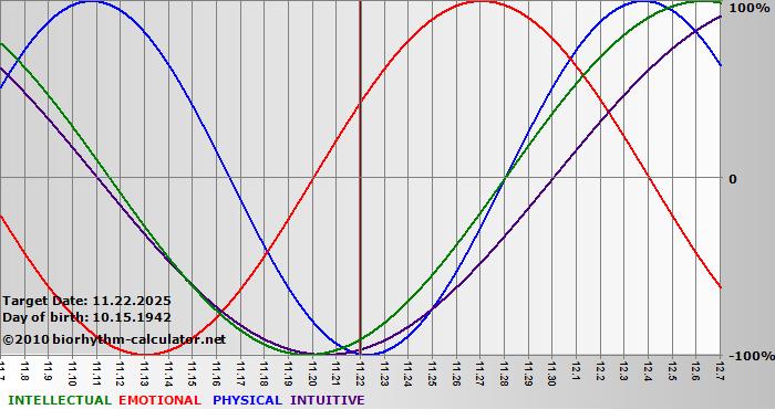 Your biorhythm above the horizontal line indicates that your capacity in that area is enhanced; you feel stronger, more alert, more connected, more empathetic. These are times when you are able to do more, be more, enjoy more. When the biorhythm lines are below 0%, your capacity is diminished, and conservative behavior is recommended.