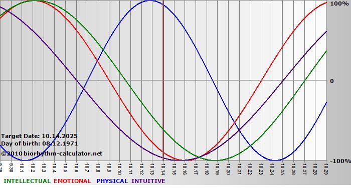 Your biorhythm above the horizontal line indicates that your capacity in that area is enhanced; you feel stronger, more alert, more connected, more empathetic. These are times when you are able to do more, be more, enjoy more. When the biorhythm lines are below 0%, your capacity is diminished, and conservative behavior is recommended.