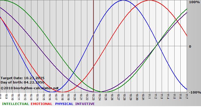 Your biorhythm above the horizontal line indicates that your capacity in that area is enhanced; you feel stronger, more alert, more connected, more empathetic. These are times when you are able to do more, be more, enjoy more. When the biorhythm lines are below 0%, your capacity is diminished, and conservative behavior is recommended.