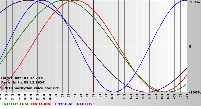 Your biorhythm above the horizontal line indicates that your capacity in that area is enhanced; you feel stronger, more alert, more connected, more empathetic. These are times when you are able to do more, be more, enjoy more. When the biorhythm lines are below 0%, your capacity is diminished, and conservative behavior is recommended.