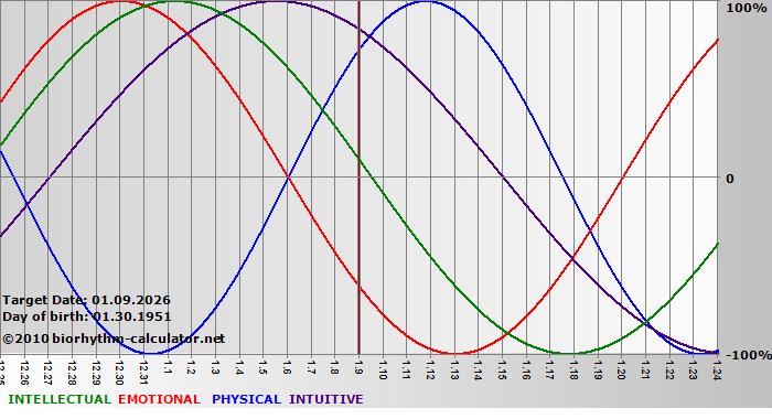Your biorhythm above the horizontal line indicates that your capacity in that area is enhanced; you feel stronger, more alert, more connected, more empathetic. These are times when you are able to do more, be more, enjoy more. When the biorhythm lines are below 0%, your capacity is diminished, and conservative behavior is recommended.