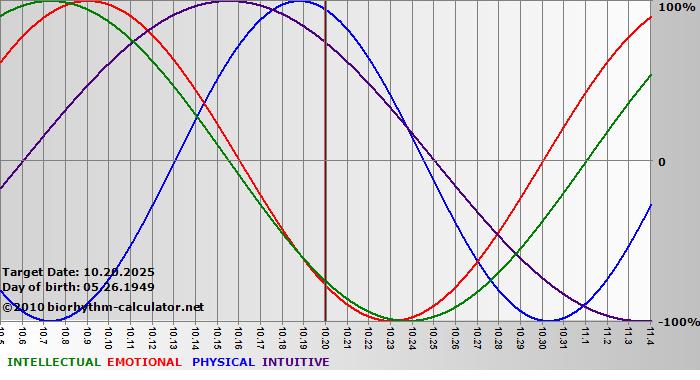 Your biorhythm above the horizontal line indicates that your capacity in that area is enhanced; you feel stronger, more alert, more connected, more empathetic. These are times when you are able to do more, be more, enjoy more. When the biorhythm lines are below 0%, your capacity is diminished, and conservative behavior is recommended.