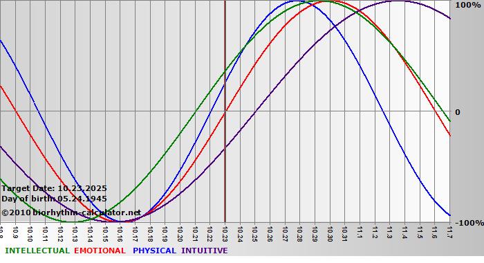 Your biorhythm above the horizontal line indicates that your capacity in that area is enhanced; you feel stronger, more alert, more connected, more empathetic. These are times when you are able to do more, be more, enjoy more. When the biorhythm lines are below 0%, your capacity is diminished, and conservative behavior is recommended.