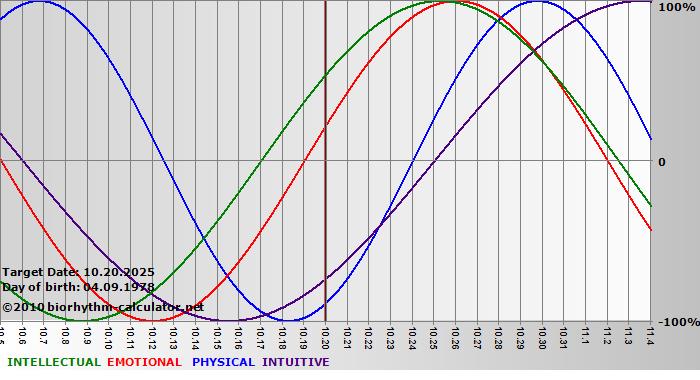 Your biorhythm above the horizontal line indicates that your capacity in that area is enhanced; you feel stronger, more alert, more connected, more empathetic. These are times when you are able to do more, be more, enjoy more. When the biorhythm lines are below 0%, your capacity is diminished, and conservative behavior is recommended.