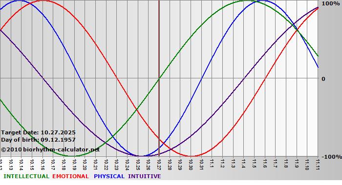 Your biorhythm above the horizontal line indicates that your capacity in that area is enhanced; you feel stronger, more alert, more connected, more empathetic. These are times when you are able to do more, be more, enjoy more. When the biorhythm lines are below 0%, your capacity is diminished, and conservative behavior is recommended.