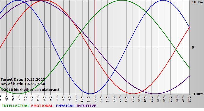 Your biorhythm above the horizontal line indicates that your capacity in that area is enhanced; you feel stronger, more alert, more connected, more empathetic. These are times when you are able to do more, be more, enjoy more. When the biorhythm lines are below 0%, your capacity is diminished, and conservative behavior is recommended.