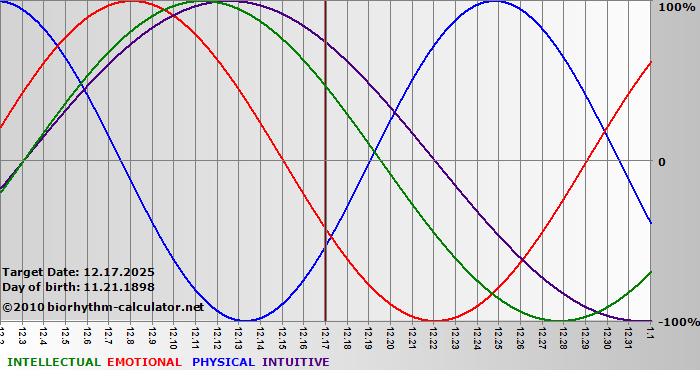 Your biorhythm above the horizontal line indicates that your capacity in that area is enhanced; you feel stronger, more alert, more connected, more empathetic. These are times when you are able to do more, be more, enjoy more. When the biorhythm lines are below 0%, your capacity is diminished, and conservative behavior is recommended.