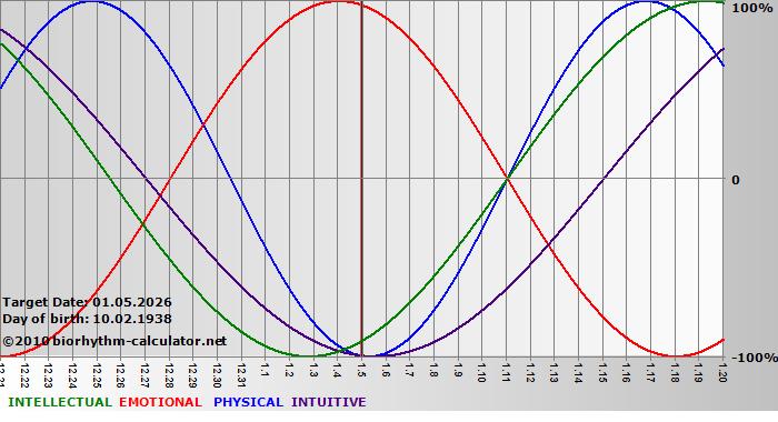 Your biorhythm above the horizontal line indicates that your capacity in that area is enhanced; you feel stronger, more alert, more connected, more empathetic. These are times when you are able to do more, be more, enjoy more. When the biorhythm lines are below 0%, your capacity is diminished, and conservative behavior is recommended.