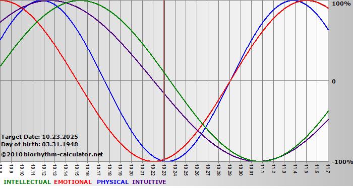 Your biorhythm above the horizontal line indicates that your capacity in that area is enhanced; you feel stronger, more alert, more connected, more empathetic. These are times when you are able to do more, be more, enjoy more. When the biorhythm lines are below 0%, your capacity is diminished, and conservative behavior is recommended.