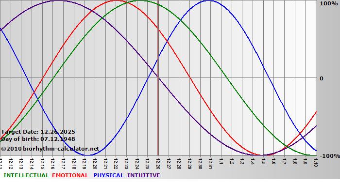 Your biorhythm above the horizontal line indicates that your capacity in that area is enhanced; you feel stronger, more alert, more connected, more empathetic. These are times when you are able to do more, be more, enjoy more. When the biorhythm lines are below 0%, your capacity is diminished, and conservative behavior is recommended.