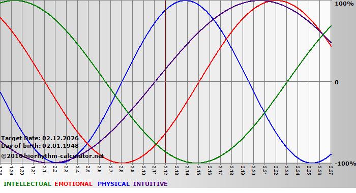 Your biorhythm above the horizontal line indicates that your capacity in that area is enhanced; you feel stronger, more alert, more connected, more empathetic. These are times when you are able to do more, be more, enjoy more. When the biorhythm lines are below 0%, your capacity is diminished, and conservative behavior is recommended.