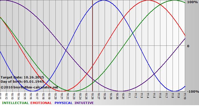 Your biorhythm above the horizontal line indicates that your capacity in that area is enhanced; you feel stronger, more alert, more connected, more empathetic. These are times when you are able to do more, be more, enjoy more. When the biorhythm lines are below 0%, your capacity is diminished, and conservative behavior is recommended.