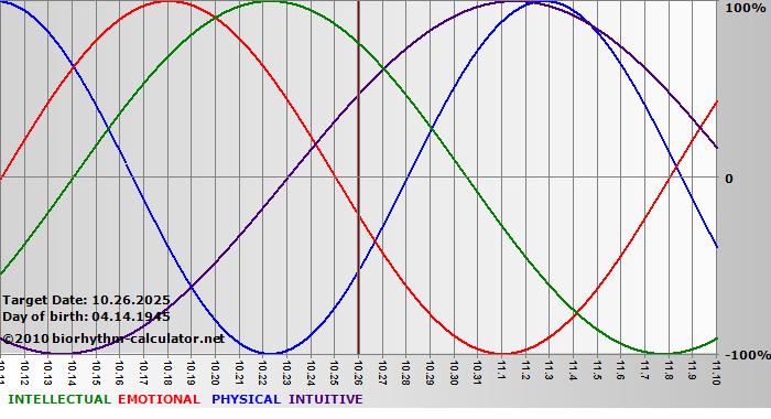 Your biorhythm above the horizontal line indicates that your capacity in that area is enhanced; you feel stronger, more alert, more connected, more empathetic. These are times when you are able to do more, be more, enjoy more. When the biorhythm lines are below 0%, your capacity is diminished, and conservative behavior is recommended.