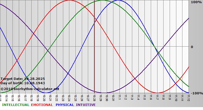 Your biorhythm above the horizontal line indicates that your capacity in that area is enhanced; you feel stronger, more alert, more connected, more empathetic. These are times when you are able to do more, be more, enjoy more. When the biorhythm lines are below 0%, your capacity is diminished, and conservative behavior is recommended.